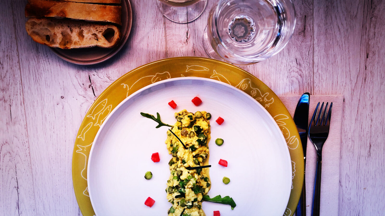 Adornar con unas hojas de rúcula y unos dados de tomate.