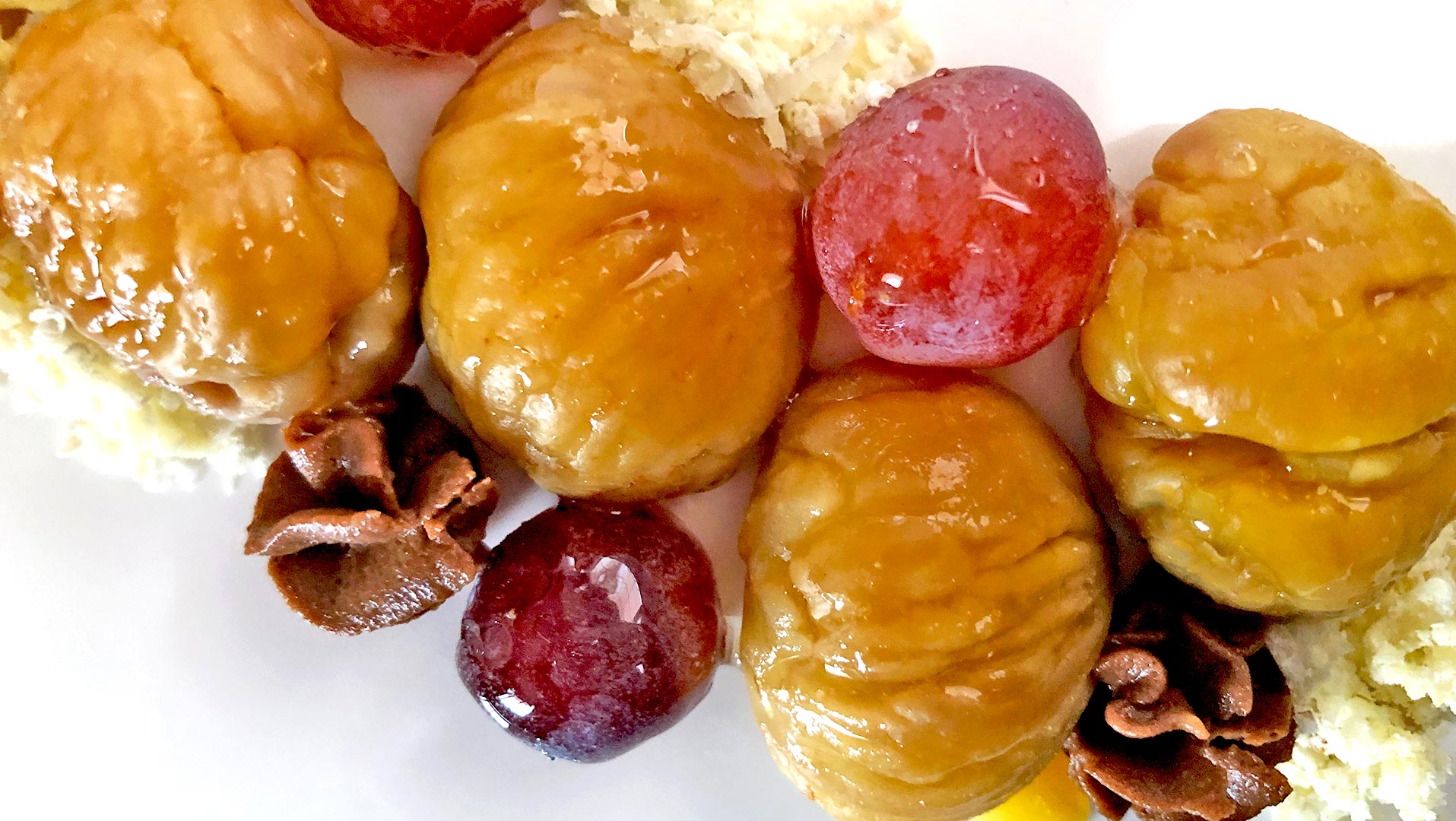 Decorar el plato de castañas con las uvas, la yema de chocolate, la yema, el crujiente de vainilla y las virutas de castaña rallada.