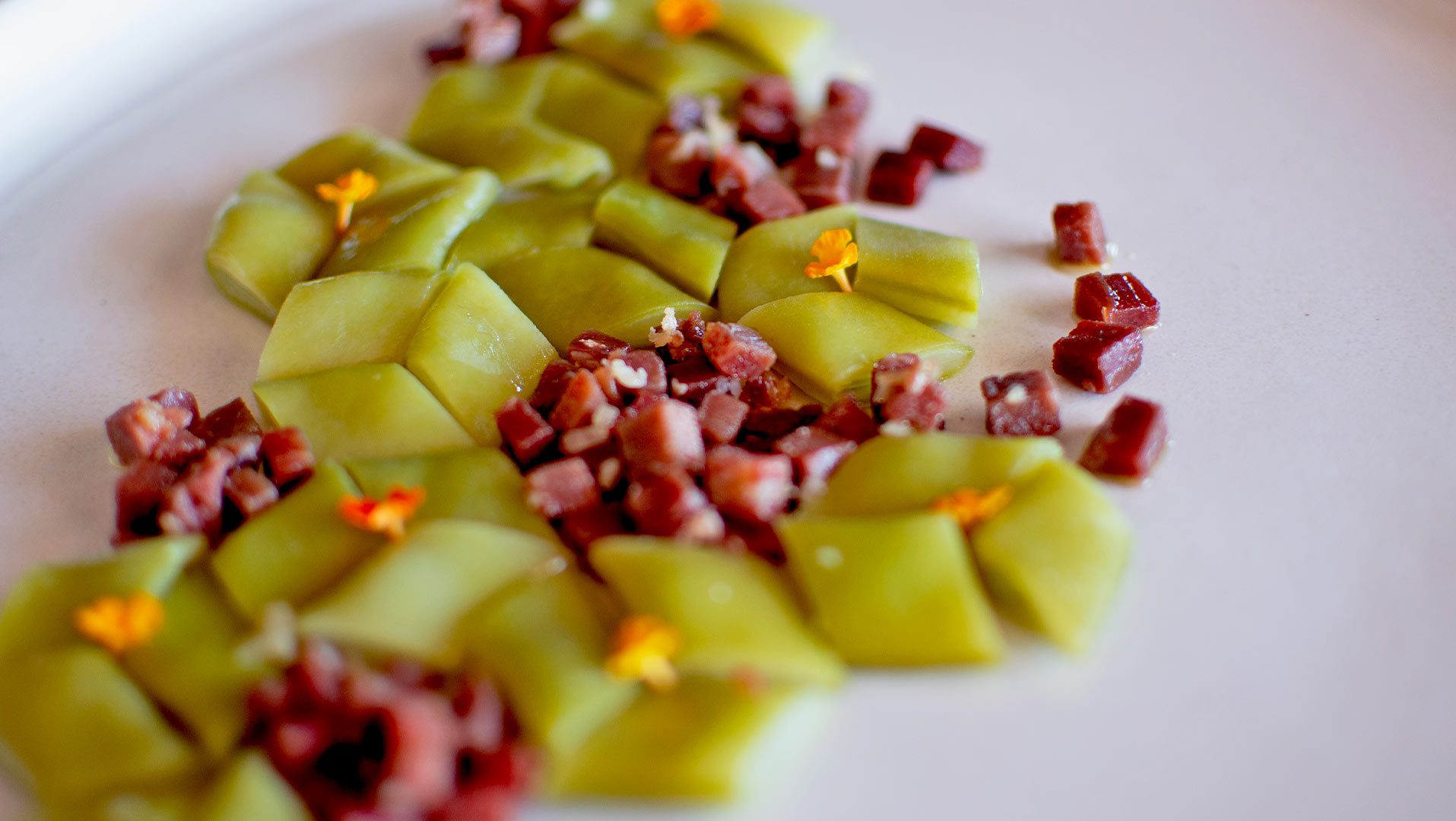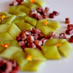 Retirar las partes más grasas del jamón. Cortar en brunoise.