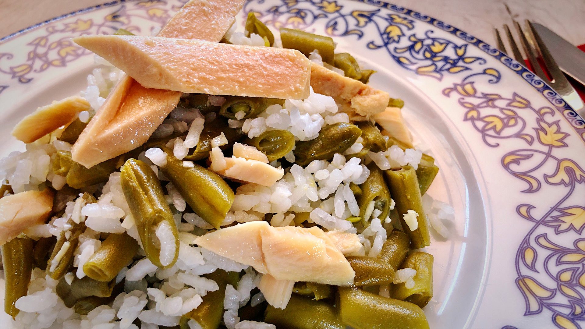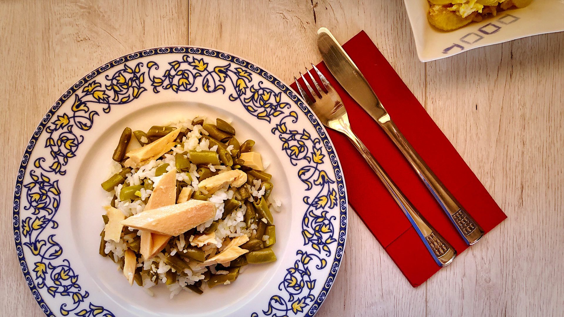 En una sartén honda con AOVE caliente sofreír el ajo, añadir las judias verdes y saltear hasta que pierdan el agua que puedan contener, 5-7 minutos. Incorporar el arroz cocido y mezclar con las judias verdes salteadas. Antes de retirar del fuego agregar el atún. Rectificar de sazón si fuera necesario.